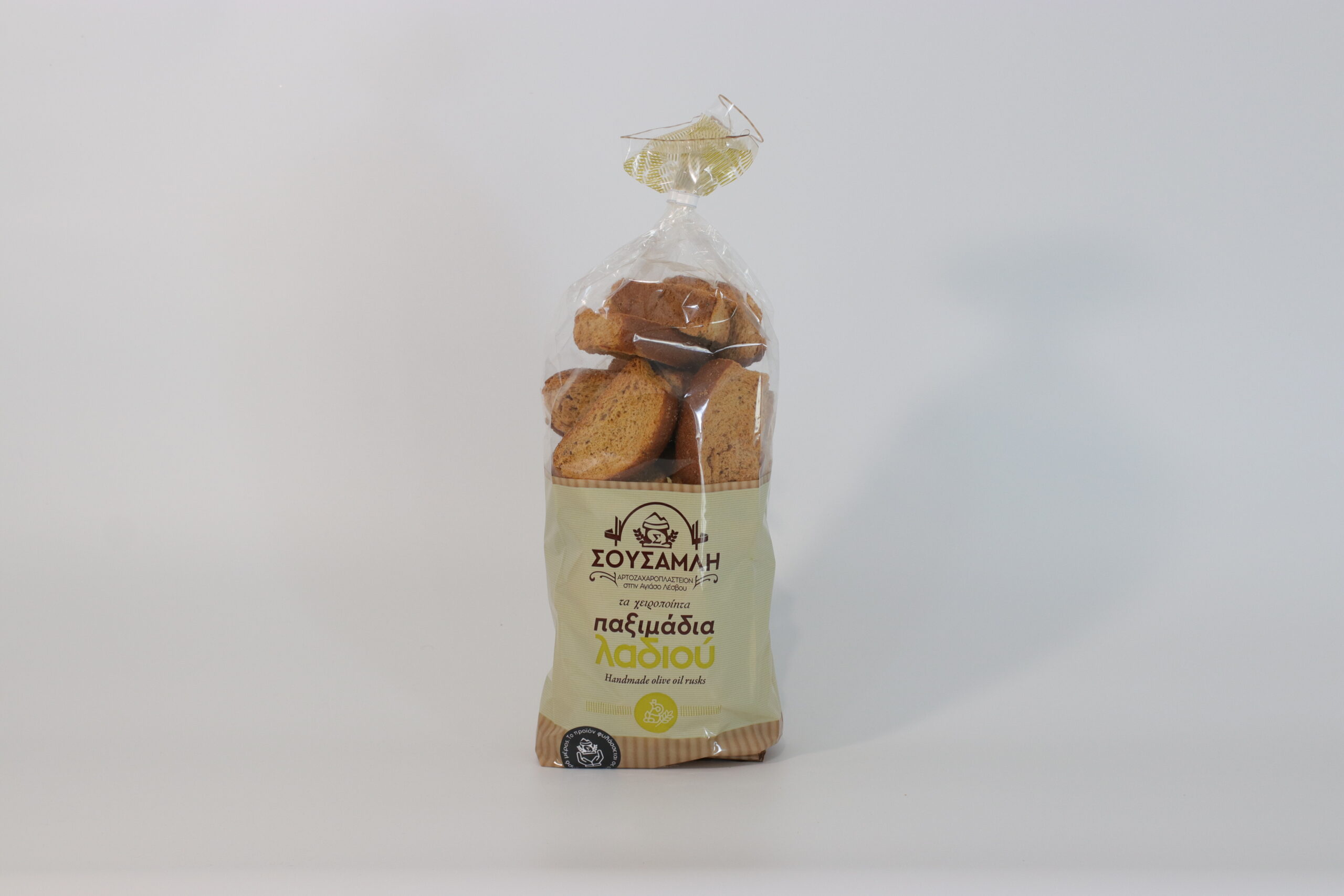 Αφράτες φέτες παξιμαδιού με ελαιόλαδο, με υπέροχο άρωμα και ισορροπημένη γεύση.